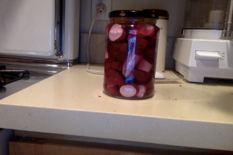 I sliced the radishes and beets to a 1/2 inch thickness, tetris-ed them into a jar, then poured the water and salt brine on top. I weighed down the veg with a silicone glass cover, and now we wait.