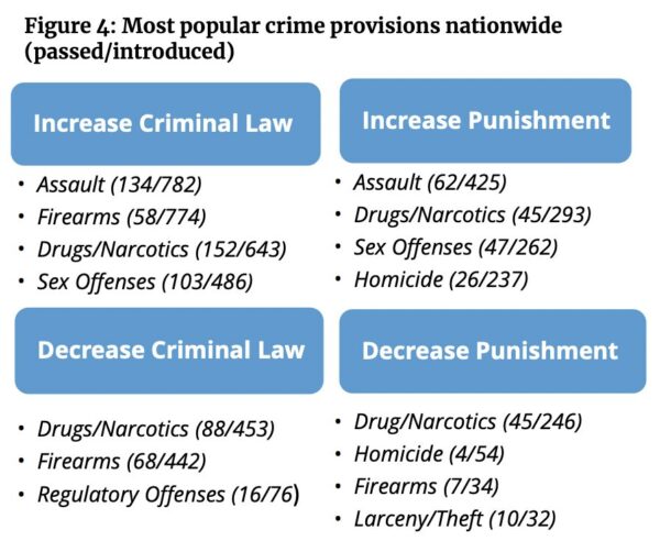 In Governing Through Crime, Jonathan Simon wrote that no politician, of any stripe, wants to be perceived as soft on crime, and the report indeed shows that the state governance (Republican or Democrat) does not usually predict what sort of bills will pass and which offenses are to be targeted: