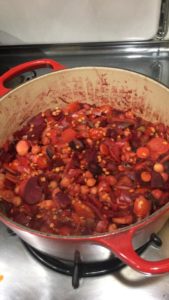 Heat up a Dutch oven on the stove until a drop of water at the center looks like mercury. Then, add onion and leeks and cook until the bottom of the pan begins to brown and the onions are translucent and a bit golden. Add a splash of vodka to deglaze the bottom, add the garlic, and cook for another 30 seconds. Add broth, tomatoes, carrot, beet, lentils, chickpeas, and spices. Place lid on Dutch oven and cook for about 25 minutes, or until the dish is fragrant and the lentils are soft.