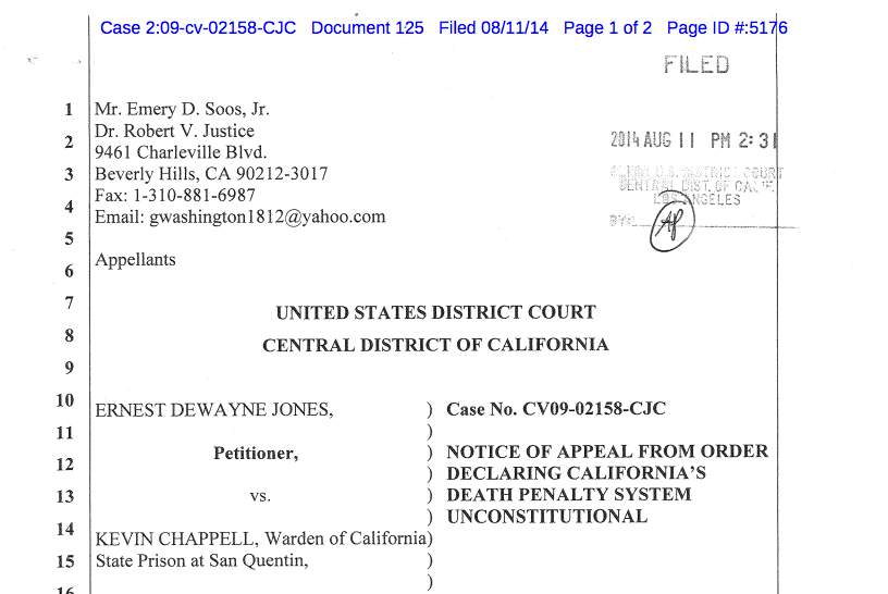 I bet you’re wondering who these mysterious appellants are, and what gives them standing, given that they are not Jones OR Chappell OR the Attorney General. Well, the signatures on the petition give away their interest in seeing the death penalty continue its slow limp into the sunset. Mr. Soos and Mr. Justice are “citizens of the State of California”.