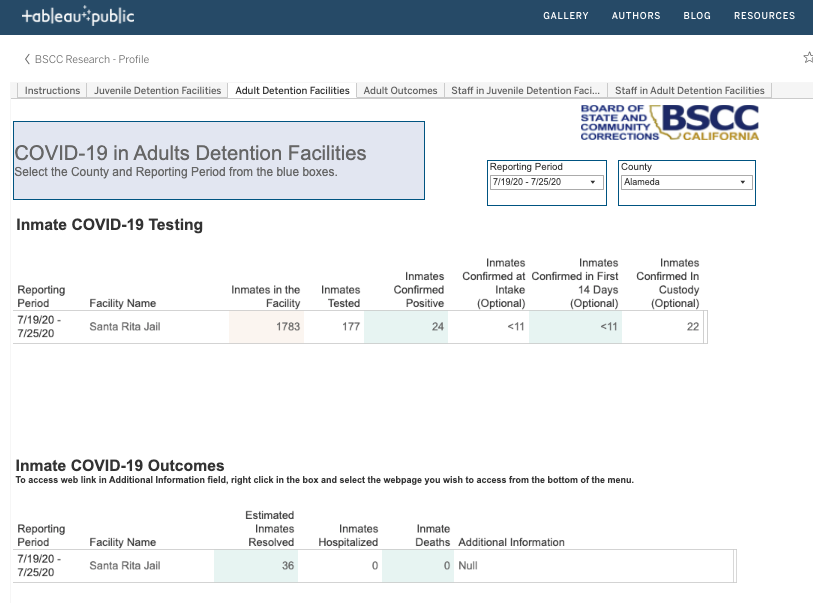 Finally, the BSCC has published its COVID-19 data on juvenile and adult county facilities. But don’t rejoice yet: it’s very sparse. For Alameda County, Santa Rita Jail is still seeing active infections, as you see above. Thankfully, so far no cases in Alameda youth facilities, but they also report having done less than 11 cases (which could or could not mean zero tests.)