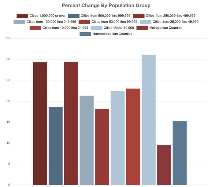 Even though the FBI data is shoddy (for which, to be sure, there’s no excuse), there are a few things we can learn from this. On Twitter this morning, Asher provided the graph at the top of this post to show that the upward trend is consistent in lots of different towns, and he also has numbers to show that it’s not a Democratic/Republican issue (cities run by both R and D administrations are seeing a rise in crime.) He also showed that the rise in homicides is accelerating over the first three quarters of 2020, refuting one-factor explanations (“this is all about Defund the Police!”).