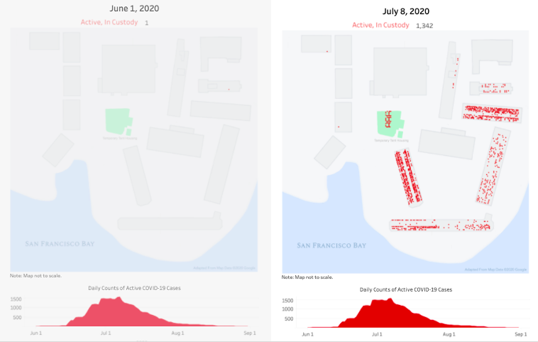 Once the incarcerated persons arrived at San Quentin, nursing staff immediately noted that two of the incarcerated persons arrived with symptoms consistent with COVID-19. Nonetheless, the prison housed almost all of the incarcerated persons who arrived from the California Institution for Men in a housing unit without solid doors, allowing air to flow in and out of the cells. By the time the prison tested the incarcerated persons for COVID-19, many of those who tested positive had been housed in the unit for at least six days. The virus then spread quickly through the housing unit and to multiple areas throughout the prison. The prison’s inability to properly quarantine and isolate incarcerated persons exposed to or infected with COVID-19, along with its practice of allowing staff to work throughout the prison during shifts or on different days, likely caused the virus to spread to multiple areas of the prison. According to data the department provided to support its COVID-19 population tracker, by the end of August 2020, 2,237 incarcerated persons and 277 staff members became infected with the virus. In addition, 28 incarcerated persons and one staff member died as a result of complications from COVID-19. In contrast, Corcoran, likely because it is a much newer prison consisting mostly of cells with solid doors, experienced a much smaller outbreak. An animated graphic displaying the progression of the COVID-19 outbreaks coursing through the various housing units at San Quentin and Corcoran after the transfers had been effected can be viewed on our website at www.oig.ca.gov.