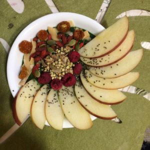 At night, place seeds in almond milk bowl to soak. In the morning, garnish with lots of fresh fruit. Voila.